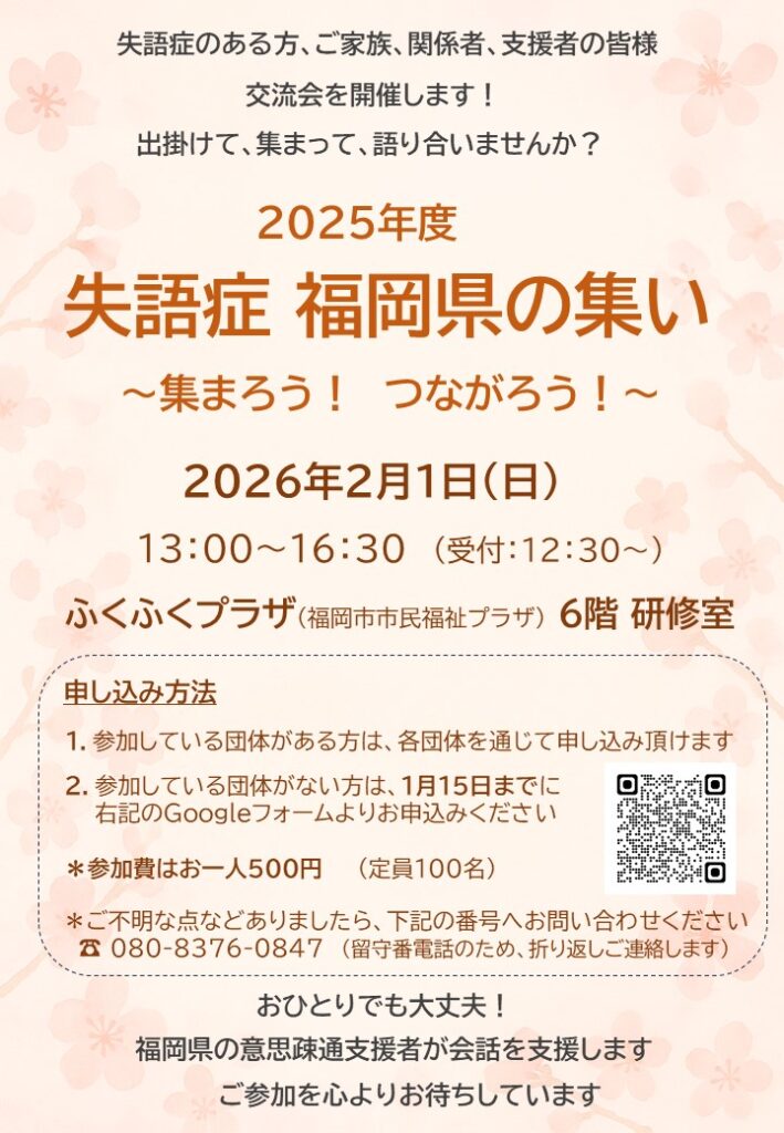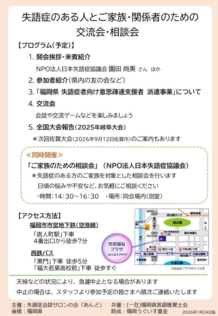 2026年2月1日(日)午後に、福岡県内の失語症のある方、ご家族、関係者、支援者の方々の交流会が開催されます。集まって、つながりましょう!  案内(p2)のpdfはこちら