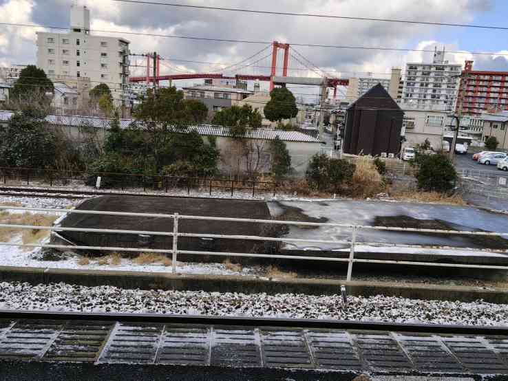 写真は朝のJR戸畑駅ホームです(若戸大橋がみえます)